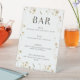 Modernes, hochmodernes Hochzeitsschild für Ihr "Bar"-Menü bietet einen kühlen, zeitgenössischen Schriftart mit zarten Wildblumen in sanften Farbtönen wie Rosa, Gelb, lila, Elfenbein und Grün. Persönlich gestalten Sie Ihr Hochzeitsgetränk mit der leicht zu bearbeitenden Vorlage mit einem romantischen Script-Schriftart und einem modernen Serif-Schriftart. Karo passende Objekte in den Sammlungen "Brautparty" und "Aquarellfarben Wildblume".
