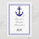 Ein Wasserschiff Anker-Boot themed Sailing themed Hochzeitsmenü in Blau und Weiß, die Ihre anderen Brautessentials ergänzen, leicht personalisiert mit den Braut- und Bräutigamen und Speisekarte zu den Vorlagen, um Ihre eigene moderne berufliche Menü für Ihre besonderen Heiratsveranstaltungen, Veranstaltungen und Feiern. Besuchen Sie den PERSONALISIERT_ WEDDINGS STORE , um die passenden Set der Hochzeitssuite zu finden. KENNEN, um die Größe und Position des Schriftartes anzupassen.
