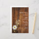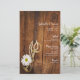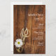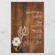 Passen Sie das lässige und dennoch klassische "White Daisy and Horse Bit Country Western Wedding Menu" mit den Details der Mahlzeit an, die Sie in Ihrem Bauernstil oder Ranch Thema Brautparty Mittagessen, Hochzeit Brunch oder Stall Party Ehe Empfang Dinner durch das Hinzufügen von Salat oder ersten Gang, Vorspeise oder zweiten Gang und Dessert oder dritten Gang. Dieses rustikale, schicke, auf das Pferd zugeschnittene Nuptialmenü bietet ein malerisches Blumenfoto mit einer weißen Blüte aus dunkler Blume, Perlenhalskette, Pferdchen- und Lederreins mit braunem, verwittertem Stallholzhintergrund.