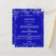 Ein klassisches Hochzeitsmenü. Ein königlich blauer Hintergrund. Weißer Text. Dekoriert mit Imitaten silbernen Glitzer, Glitzern. Personalisieren Sie Ihren Namen, das Datum und das Menü und fügen Sie es hinzu. Sie können mehr Text hinzufügen, Fotos auf der Rückseite. 1 Blatt = 1 Menü, mit dem die Kante an Kante aufgedruckt ist.