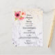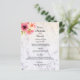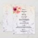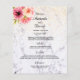 Eine elegante und romantische Hochzeitskarte. Weißer Marmorprint mit goldenem Konfetti als Hintergrund. Wasserfarbene Dahlia-Blume in lila, rosa und lebendigen Korallen. Vorlagen für Ihre Namen, Datum und Hochzeitsmenü.