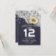 Hochzeitssitzplatz / Tischnummer / Escort Card Vorlagen - Elegante Sonnenblumen, Vintage Spitzen-Rahmen und schicke Streichellichter auf blauem Navy Hintergrund. Ein perfektes Design für Ihren großen Tag. Alle Textstile, Farben, Größen können an Ihre Bedürfnisse angepasst werden!