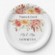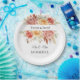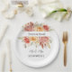 Hochzeitspapier-Teller werden in einer hübschen Rose mit Blumendruck mit benutzerdefinierten Beispielnamen in schwarzer Schrift gezeigt. Passen Sie dieses Element an, und ändern Sie die Beispielnamen in Ihren Namen. Börsenbild freepik.com