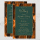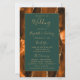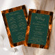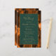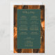 Dieses elegante, moderne Hochzeitsprogramm verfügt über einen verbrannten orangefarbenen und rostfarbenen Achat-Hintergrund, der mit goldenem falschen Glitter besetzt ist. Der Text erscheint in eleganter goldfarbener Handschrift und Kupferstich-Schriftarten auf einem dunkelgrünen Rechteck.