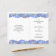 Hellblaue Hochzeitsprogramme mit Blumen. Die gefalteten Programme sind weiß mit blauer Hydrangea, blühende Ränder auf der Vorderseite und schwarzer Text. Text ist lang genug, um für eine katholische Zeremonie mit einer Danksagung auf der Rückseite zu verwenden.