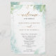 Elegantes Hochzeitsprogramm mit zartem Aquarellfarbenhintergrund und Topgrün in türkisfarbenen, aqua-, staubblauen und sanften grünen Farbtönen. Golddetails in Blätter, Fesseln und moderne handgeschriebene Kalligraphie. Möglichkeit, Textänderungen und Anpassungen durch Auswahl weiterer Anpassungen vorzunehmen. Front mit den Details der Hochzeitsfeier, zurück mit den Namen der Hochzeitsfeier und danke Ihnen für die Nachricht für Ihre Gäste. Elegantes modernes Ambiente. Auch ohne Gründetails erhältlich, aber behaltend Aquarellfärbungen im Hintergrund. Teil unserer Kollektion "Airy Blue and Green Watercolor" mit einer Vielzahl von Produkten zur Koordination.