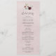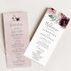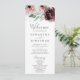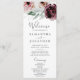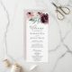 Dieses blumenromanische Hochzeitsprogramm eignet sich perfekt für eine elegante Hochzeit. Das moderne rustikale bohobische Design besticht durch romantische Aquarellfarben in sanften Farbtönen wie Bordeaux, Lila, Rosa und Cremeweiß mit grünen Blätter. Geben Sie den Namen der Braut und des Bräutigams, das Datum und den Ort der Hochzeit, Dankeschön-Nachricht, Dienstordnung, Brautparty und ein optionales "in Loving Memorial" ein.
