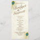 Elegantes, goldenes Pfauenfederdesign bedruckte Hochzeitsprogramme mit braunem Text auf einer Rackkarte.