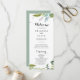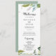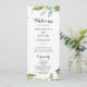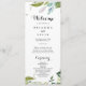 Dieses Hochzeitsprogramm für tropische Kalligraphie ist perfekt für eine einfache Hochzeit. Das Design besteht vorwiegend aus grünen tropischen Blätter mit einer Touch von rosa blütigen Blume, die elegant in Kränze und geometrische Formen angeordnet sind.