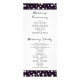 Lila Berge und Nadelbäume Zeremonie und Party Hochzeitsprogramm . Ein elegantes Hochzeitsdesign mit einer Bergkette durch Koniferen und Ihre Namen in handgeschriebenem Stil. Auf der Rückseite befinden sich dunkel-weiße Ränder mit weißen Polka-Punkten oben und unten auf der Karte.