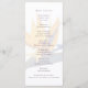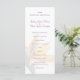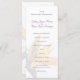 Paradise-Hochzeitsprogramm-Vorlage für Bird-of-Paradies. Große, flache Programme sind 4x9 Zoll mit weißem Papier mit optionalen Upgrades. Der Text ist dunkel lila mit der Reihenfolge der Zeremonie auf der Vorderseite und mehr Text auf der Rückseite, um die Mitglieder der Hochzeitsfeier aufzulisten und besonderen Menschen zu danken. Die Namen sind im modernen Kalligraphiedruck und der Rest der Formulierung ist Großbuchstaben. Eine exotische, gelbe Paradiesvogel-Blume ist der Hintergrund für Text auf beiden Seiten.