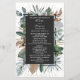 Palm Blätter und andere botanische Designs rund um dunkelgraues Rechteck mit weißem Text.