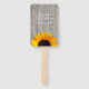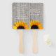 Rustikaler Hochzeitsfan, mit einem ausgewaschenen Holzzaun-Look und einer großen gelben Sonnenblume, die von unten nach oben schaut. Personalisieren Sie den Text für Ihren Hochzeitstag.