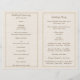 Elegante weiße Spitzen mit Band und Sonnenblumen auf eingeklapptem Hochzeitsprogramm. Es zeigt weiße Spitzen auf beige Naturburlap mit zwei gekreuzten Satinbändern und Sonnenblumen. Text in braun. Beachten Sie, dass Spitzen, Burlap und Sonnenblumen alle "bedruckt" sind und nicht echte Stoffe oder Blume. Man muss sich in der Mitte falten, um ein gefaltetes Programm zu haben. Wählen Sie nur den Papierwerttyp aus, der sich gut faltet.