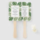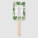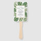 Tropische Blätter in Grün und Gold Hochzeitskalender Hand Fan. Es zeigt Blätter von Split Leaf Philodendron (Monstera deliciosa) oder Schweizer Käse Pflanze und Palmen Blätter in grün mit goldenen Kontur . Ihre Formulierung ist in einem weißen Rahmen mit goldener Kontur.
