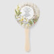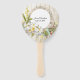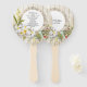 Hochzeitsfans mit tropischen Themen, die in einem weißen Holzrahmen mit tropischen Blume, Blattwerk und Muscheln gestaltet wurden. Personalisieren Sie alle Textfelder für Ihre Hochzeit.
