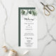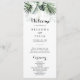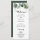 Dieses Hochzeitsprogramm im tropischen Grün mit weißer Blüte eignet sich perfekt für eine Hochzeit in Urlaubsort. Die Einrichtung besteht aus grünen Palmenbouquets mit hübschen weißen Blume.