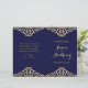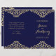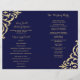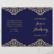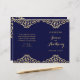 Dieses elegante, traditionsreiche Hochzeitsprogramm besticht durch eine delikate Golddamastenschmuck auf marineblau-blauem Hintergrund. Ideal für eine Vintage Deko-Hochzeit. Diese Größe soll wie ein Büchlein in der Mitte gefaltet werden. Papier wird nicht perforiert.