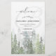 Schönes Pine Woods Forest Hochzeitsprogramm Papier-Blatt-Design mit einem Aquarell Kiefernwald und einem großen "Willkommensgruß" in einem eleganten Skript sowie Ihre Monogramm und das Hochzeitsprogramm Details für Sie zu personalisieren.