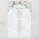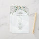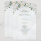 Die Karte des Hochzeitsprogramms ist in einem sanften, eleganten Stil gehalten und in Pastellfarben gehalten, wobei die Farbtöne Grün und Weiß dominieren. Oben befindet sich eine wunderschöne Mischung aus Blume in Weiß und Creme, einschließlich Rose und anderen zarten Blüten, vermischt mit grünen Blätter. Die Namen werden in der Mitte in einem stylischen, kursiven Schriftart mit einer Darstellung der miteinander verflochtenen Eheringe unter den Namen prominent dargestellt. Das Design ist durchdacht und romantisch, ideal für eine Hochzeitsfeier.