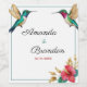 Ein lebhaftes und elegantes Hochzeitskonzept mit zwei farbenfrohen Kolibris, gepaart mit einer lebhaften tropischen Blume und goldenem Blattwerk. Ein perfektes Design für tropische, sommerliche oder Hochzeiten in Urlaubsort.