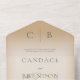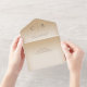 MIT ODER OHNE QR-CODE ZUM AUSSCHLIESSEN. Dieses schlichte und dennoch elegante Design mit zwei vergoldeten Hochzeitsringen auf einem weichen, weißen, blurfarbenen Overlay auf einem bräunlichen Hintergrund ist modern. Personalisierte All-In-One-Einladungen sind eine einzigartige Kombination aus einer schön gedruckten, maßgeschneiderten Einladung und einer leicht zu abreißenden perforierten UAWG-Postkarte. Und sie sind so einfach zu bedienen! Man falte einfach, dann Siegel die Rückklappe mit den drei beiliegenden Klarkleben, und Post. Und wenn Ihre Gäste Ihre persönliche Einladung erhalten, reißen sie einfach die perforierte RSVP Karte ab und lassen sie in der Mail an Sie zurück!