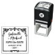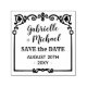 Diese personalisierte Hochzeitskautschuk-Briefmarke hat einen Vintagen Zierrahmen, der an eine quadratische Briefmarke angepasst wurde. Es enthält Platz für die Braut- und Bräutigamen, sowie die Worte "Save the Date" und das Hochzeitstag. Mit der Vorlage können Sie den Text personalisieren.