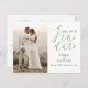 Eine wunderschöne Save the Date Postkarte mit Ihrem vertikalen Foto auf dem vorderen Set neben dem eleganten Drehbuch "Save the Date" Handschrift in zauberhaftem Grün. Geben Sie Namen, Datum und Ort ein, um Ihre persönlichen Daten zu verändern. Auf der Rückseite finden Sie alle Ihre persönlichen Daten. Einfach, klassisch, elegant mit minimalem modernem Ambiente - Koordiniert wunderbar mit so vielen heutigen Hochzeitsstilen/Themen.