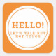 Soziale Entfernung Hochzeit Bernstein Hallo Aufkleber. Helfen Sie Ihren Gästen, sich sicher zu fühlen und lassen, dass sie wissen müssen, dass sie eine Entfernung behalten haben, um sich selbst oder verwundbarere Gäste zu schützen. Code gelb-orange Hochzeitsaufkleber liest Hallo! Lass uns reden, aber nicht Touch. Ideal, um einen Gast-Virus Sicherheit Hochzeitskit oder Event-Kit hinzuzufügen. Entsprechende Poster und Anleitungen sind ebenfalls verfügbar. Entworfen von www.mylittleedenweddings.com