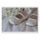 zwei kleine Hochzeitsschuhe für eine Brautjungfrau oder Blume in Elfenbeinseide mit einem Strauß dahinter