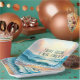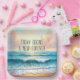 Wellen rollen sanft auf einen Sandstrand unter einem blühenden Himmel voller flauschiger, rosa Wolken. Zitat kann geändert oder gelöscht werden.