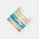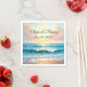 Wellen rollen sanft auf einen Sandstrand unter einem blühenden Himmel voller flauschiger, rosa Wolken. Namen und Datum können geändert werden.