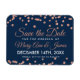 Elegantes Hochzeitsdesign "Save the Date" mit Rose Gold Imitate Glitzer Confetti Navy Blau und individuelle Namen und Datum Text.