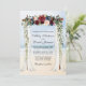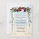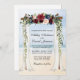 Die elegante Hochzeitskanopie Watercolor Burgundy Marsala Floral Wedding Invitation Card beinhaltet eine schöne bordeauxfarbene Rose, rosa Rosen, rote Blume und blaue Blumen. Der Botanische Garten des Hochzeitskappenbogens aus Holz liegt auf einem sandigem, blau-himmelblauen Hintergrund.