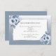 Eine elegante Übernachtungskarte. Ein silber-weißes Imitat mit Rose in Aquarelltönen. Ein chic dusty blauer Farbverlauf, ombre Hintergrund. Vorlagen für Ihre Hochzeitsunterkunft Details, dunkelgrauer Text. Zurück: staubiger blauer Hintergrund. Ideal für eine Winter- oder Frühjahrsheirat.