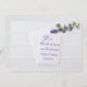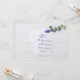 Weiße Hochzeitseinladung mit Umschlag und violetten Blumen auf weißem Holz.