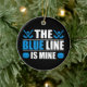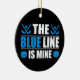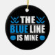 Hockey Blue Line Ornament bietet blaue Pucks und Hockey Sticks mit weißem und blauem Text, der auf The Blue Line is Mine steht.