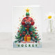 This card shows a hockey player turning into a Christmas tree! 🎄 He wears a green helmet and a red-and-white jersey, and holds a red hockey stick. On his legs are shiny Christmas decorations and a golden star on his head. He's on a white background, looking confident and festive. The colors are red, green, gold, and black, giving a warm holiday feeling.