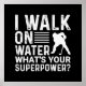 Weißes Textposter auf schwarzem Hintergrund, das Sie in jede gewollt Farbe ändern können, liest I Walk On Water What's Your Superpower?