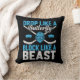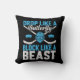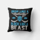 Hockey Goalie werfen Kissen mit blauem und weißem Text, Helm mit Maske, Pucks und Hockey Sticks liest Drop wie ein Schmetterlingblock Wie ein Besen!