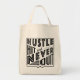 Field Hockey Hustle Hit & Never Tote Bag. Text liest: Hustle, Hit und Niemals beenden, mit einem gekreuzten Feld Hockey-Sticks Icon.