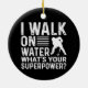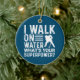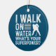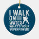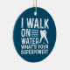 Hockeyspieler-Ornament mit einem humorvollen Sprichwort mit weißem Text auf blauem Hintergrund und einem Hockeyspieler mit weißer Silhouette. Der Text auf diesem Hockeyspieler Ornament lautet: Ich gehe auf Wasser Was ist deine Supermacht?