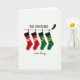 This fun, sports-themed Christmas card is designed for the hockey lover in your life. The card features a clever twist on the classic holiday image, showing four Christmas stockings hanging from a hockey stick instead of a traditional mantle. The stockings are styled in red and green with bold stripes, resembling the colors of a team's jersey or gear. The classic holiday text "THE STOCKINGS were hung" is split above and below the stockings. This simple, festive design is a great way to send holiday greetings to hockey fans and players.