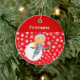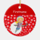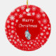 Bieten Sie Ihrem Kleinen Hockey-Spieler einen niedlichen personalisierten Hockey-Ornament für die Weihnachtsbaumfront an: Weißer Schnee auf rotem Hintergrund + Klein-Hockey-Spieler + personalisieren mit Hockey-Player-Namen in weiß über Rot Back-Design: Weißer Schnee auf rotem Hintergrund + Frohe Weihnachten + Pair von Kinderhockey-Skaten
