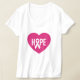 Ein Brustkrebs-Bewusstseins-T - Shirt, der ein rosa Herz mit dem Wort "Hoffnung" kennzeichnet. Der Buchstabe "O" wird mit einem Brustkrebs-Bewusstseinsband dargestellt.