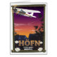 Höfn Island-Flugplakat der Eislandschaft mit einem kleinen, niedrig fliegenden Requisiten-Flugzeug und einem Rucksack mit isländischer Nationalflagge.