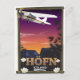 Höfn Island-Flugplakat der Eislandschaft mit einem kleinen, niedrig fliegenden Requisiten-Flugzeug und einem Rucksack mit isländischer Nationalflagge.