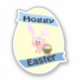 Hoggy Oaster! Niedliches Osterschwein mit sonnigen Ohren mit einem Korb voller Eier und einem Ei-Hintergrund.