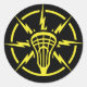 Gefahr! Hochspannungs-Lacrosse-Player. Cooles Superheld-Emblem aus Lacrosse-Stabkopf mit Blitzschrauben von allen Seiten aus.