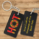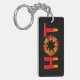 Heiß mit dem Buchstaben O aus einem Flammenkreis mit Chili-Paprikaschoten. Benutzerdefinierte Hintergrundfarbe. Benutzerdefinierter Text auf der Rückseite.